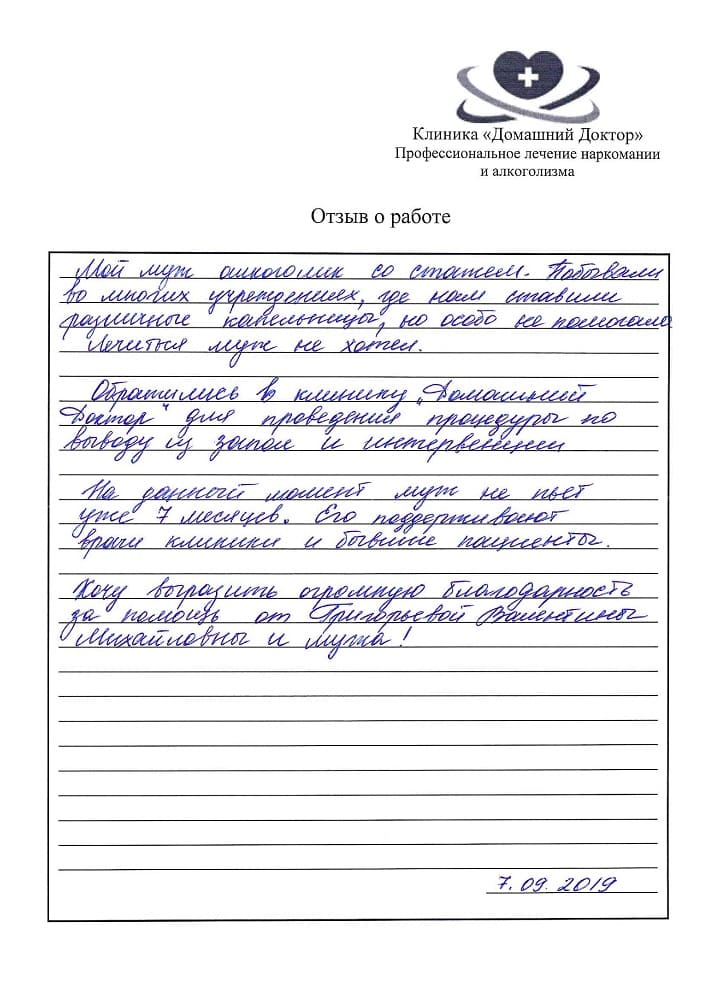 Мой муж долго сопротивлялся, но я настояла на кодировании от алкоголизма. После этого он стал трезвым, и наша жизнь улучшилась. Мы с ним благодарны врачам за этот шаг и за результаты, которые мы получили.